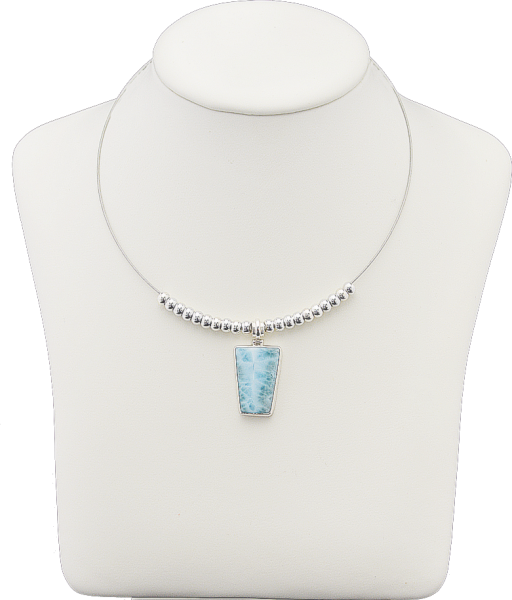 Larimar Angehänger gefasst in Silber 925, 30 mm lang, 20 mm breit, mit 20 Metallkugeln versilbert und Stahlreif mit Schraubverschluß 45 cm lang