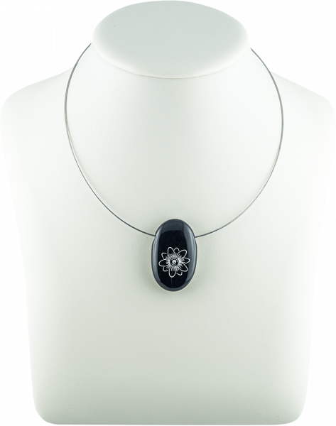 Onyx, Edelstein graviert, mit seitlicher Bohrung, in polierter Oberfläche, mit Edelstahlreif incl. Schraubverschluss, 45 cm lang