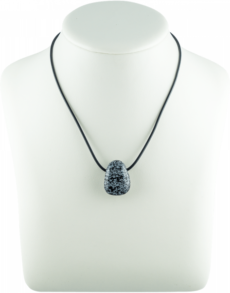 Schneeflocken Obsidian, Edelstein in polierter Oberfläche, Länge ca. 30 mm, Breite ca. 20 mm, mit Kautschuk Reif flexibel, Farbe schwarz, und Karabinerverschluss Silber 925, 2,0 mm stark, 45 cm lang